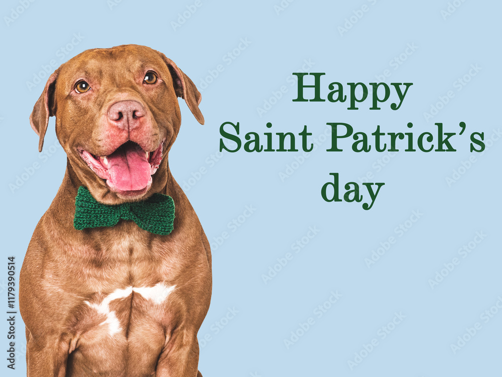 Happy St. Patrick's Day. Lovable, pretty dog and bright green bow tie. Closeup, studio shot. Congratulations for family, loved ones, relatives, friends and colleagues. Pet care concept
