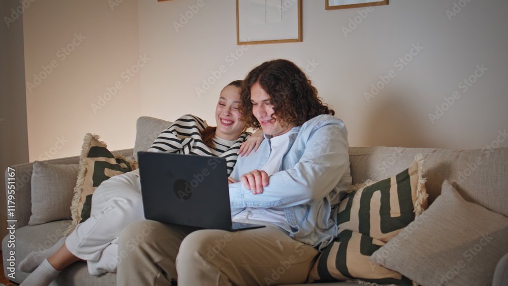 Spouses enjoy video meeting with friends sitting cozy living room sofa evening.