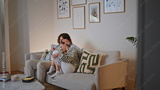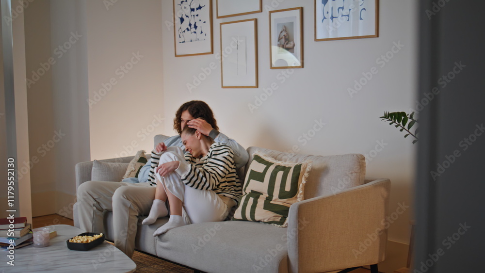 Husband embrace wife watching scary movie on cozy sofa at family evening.