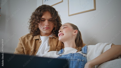 Bonding couple watching laptop on comfortable home couch closeup. Married pair