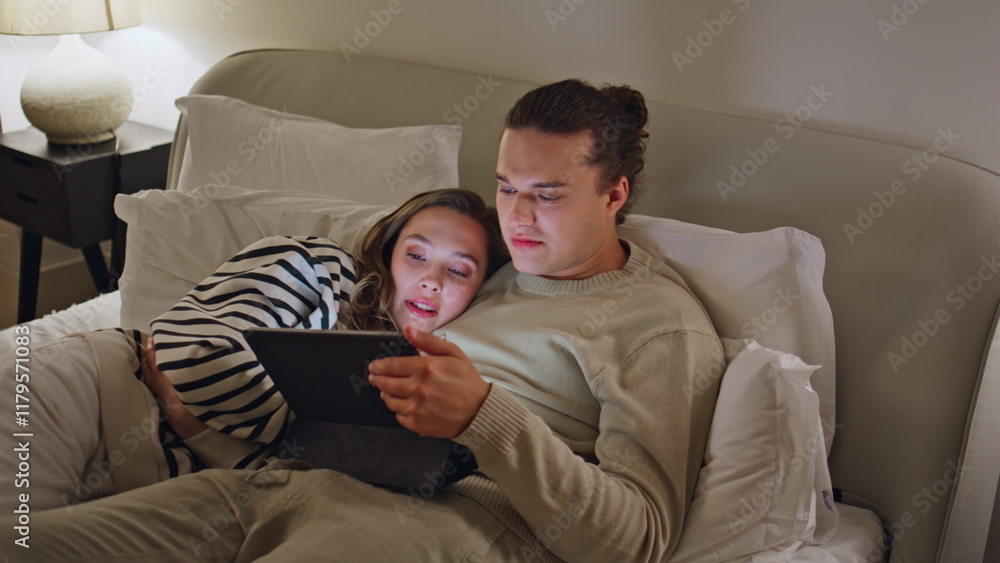 Couple watching tablet bed apartment closeup. Wife husband lying cozy bedroom