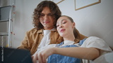 Happy couple shopping online using laptop at home sofa closeup. Positive spouses