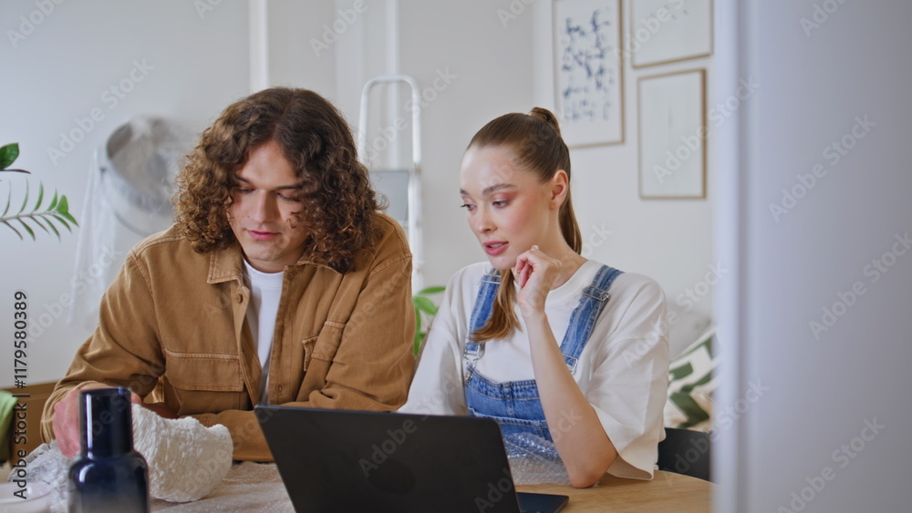 Creative couple planning home decor discussing ideas with laptop closeup.