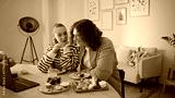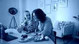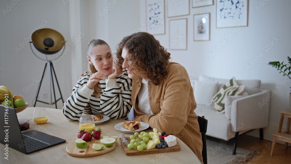 Woman enjoying breakfast boyfriend at home closeup. Smiling couple laptop
