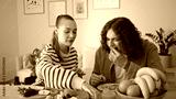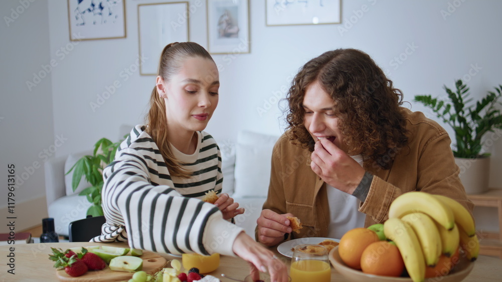 Romantic pair enjoy breakfast together in modern kitchen. Smiling woman and man