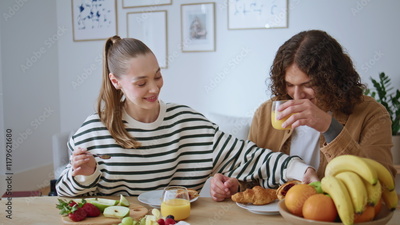 Happy spouses eating breakfast enjoying romantic morning together closeup.