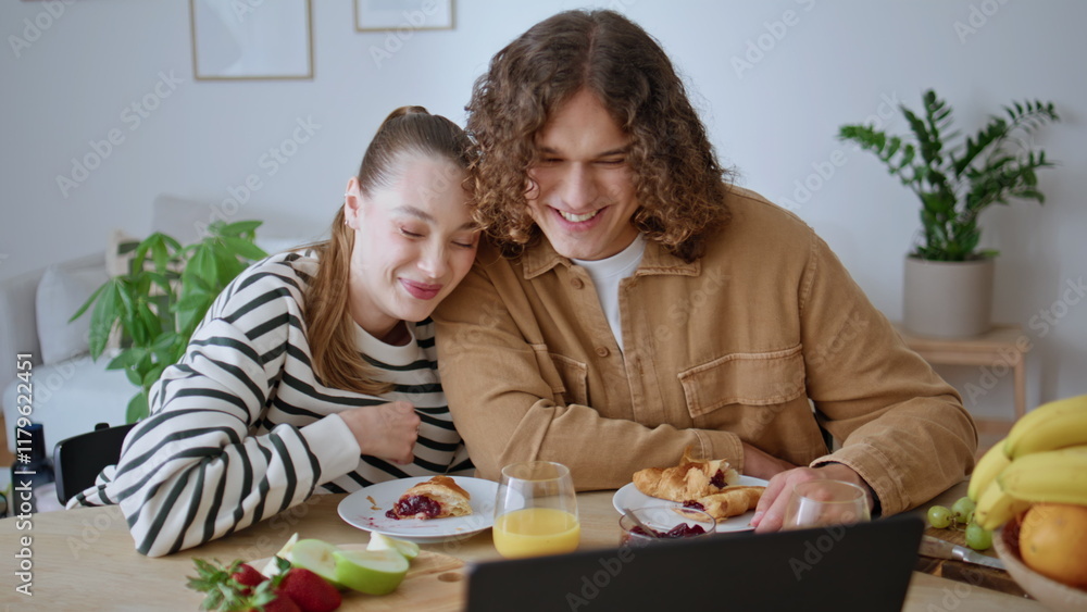Bonding couple watching laptop laughing together have breakfast at home closeup.