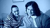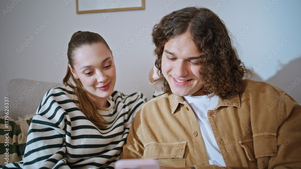 Loving spouses smiling together relaxing on cozy couch with smartphone closeup.