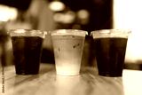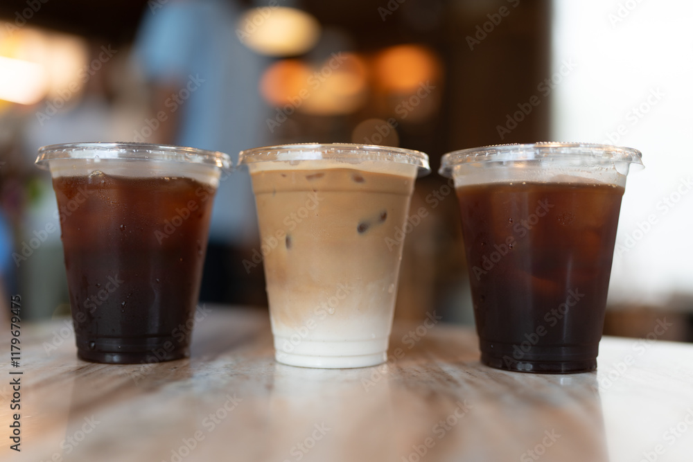 A row of three plastic take away cup of iced black coffee americano and iced coffee latte on table in coffee shop