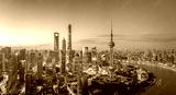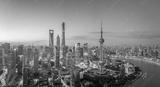 Panoramic view of a modern city skyline with iconic tower and illuminated buildings at twilight in Shanghai