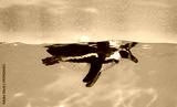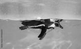 The penguin swims underwater in the sea.