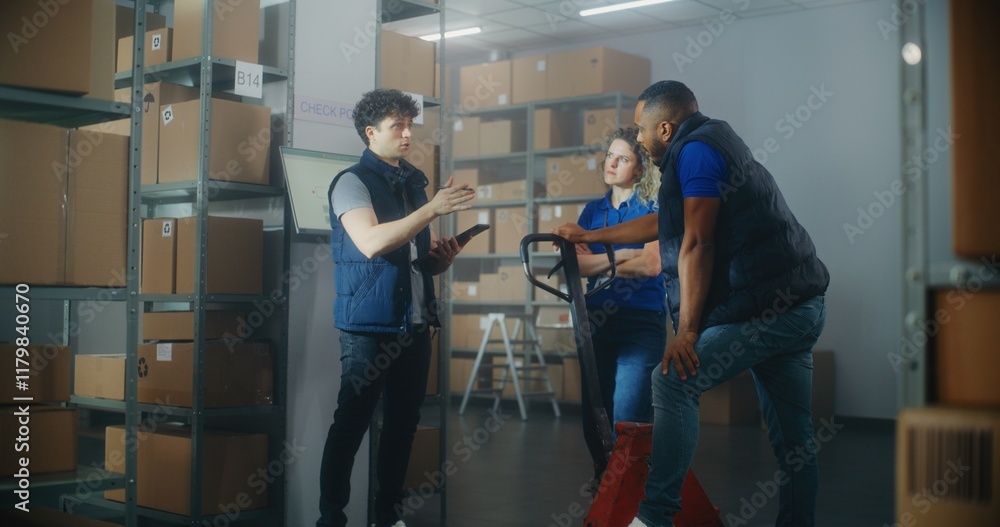 Inventory specialist gives instructions to colleagues, uses tablet computer. Diverse warehouse employees working in sorting center with cardboard boxes, E-commerce online orders, goods for shipping.