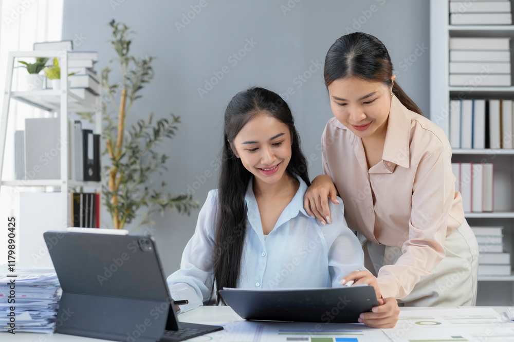 Two asian businesswomen reviewing marketing strategy using digital tablet and documents, working together in modern office