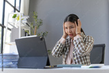 Overwhelmed businesswoman feeling stressed and frustrated while working with digital tablet in office