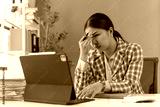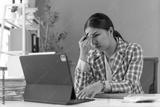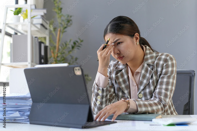 Focused businesswoman working at her desk, stressed while looking at a laptop, surrounded by documents in a modern office setting