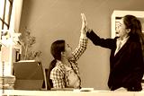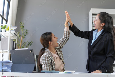 Two happy businesswomen celebrating successful closing deal, giving high five in modern office