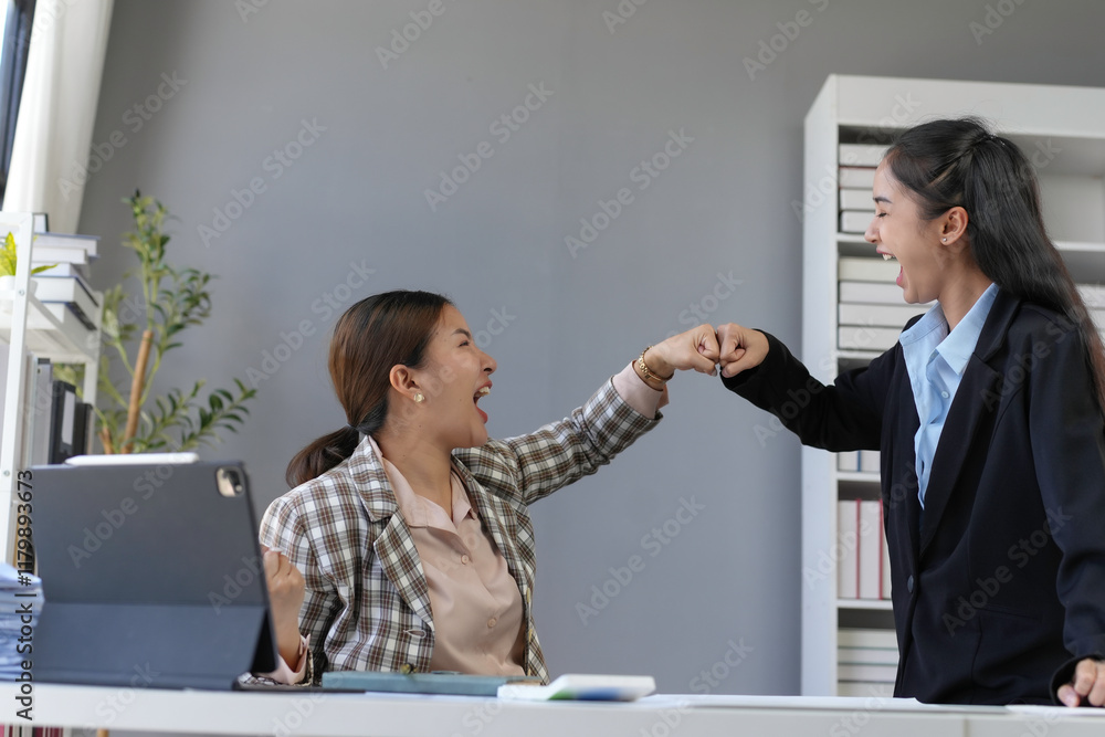 Two excited businesswomen celebrating a corporate victory with a fist bump in the office, showcasing teamwork and professional achievement