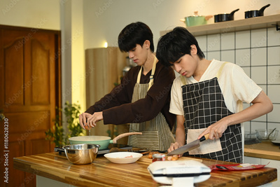 Affectionate gay couple wearing aprons preparing meal on the kitchen counter surrounded by fresh ingredients