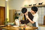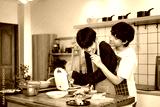 Joyful gay couple sharing a lighthearted moment in the kitchen while preparing food together.