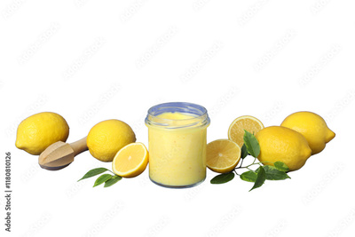 PNG, Lemon curd, lemon with cream in a glass, transparent jar, isolated on a white background.