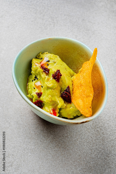 guacamole with corn chips on table