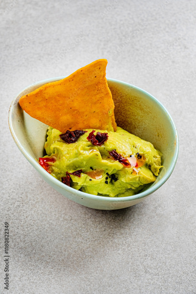 guacamole with corn chips on table