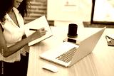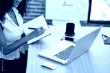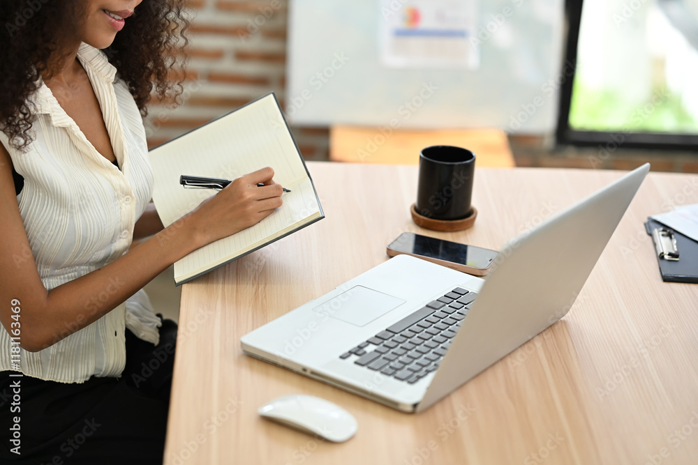Young entrepreneur jotting down notes in a notebook while working on a laptop