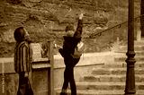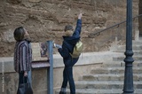 Two friends exploring historical landmarks during a cultural tour in a Spanish town, analyzing ancient architecture and sharing discoveries on a chilly day