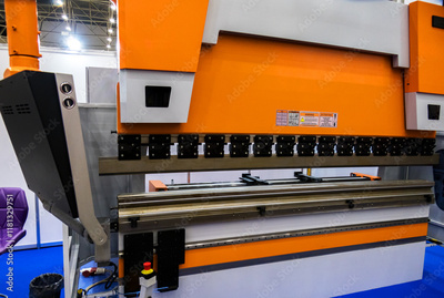 A substantial industrial press brake, predominantly painted in a striking orange hue. The machine is equipped with advanced digital controls and features a robust frame.