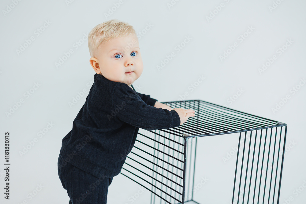 8 month old baby standing independently near a support. Baby learning to stand. Baby development.