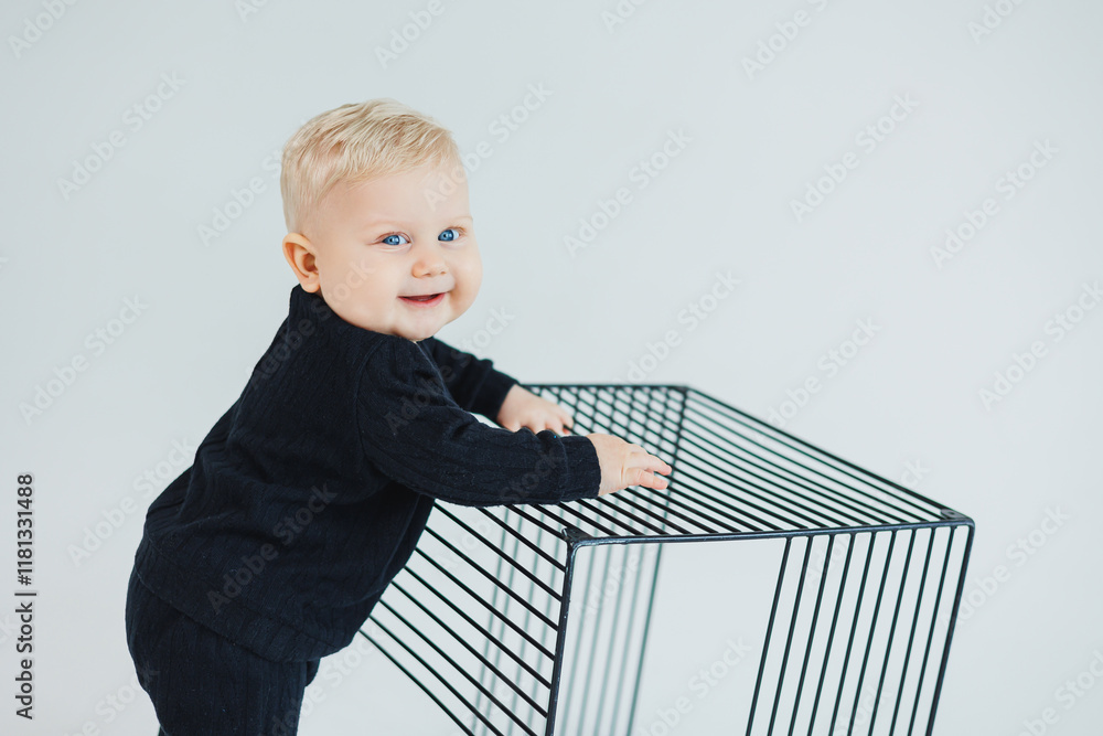 8 month old baby standing independently near a support. Baby learning to stand. Baby development.