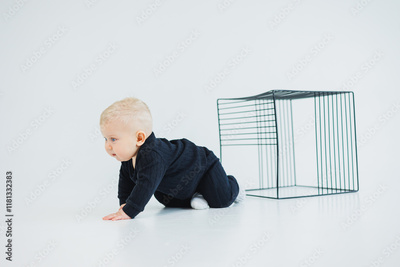 8 month old baby standing independently near a support. Baby learning to stand. Baby development.