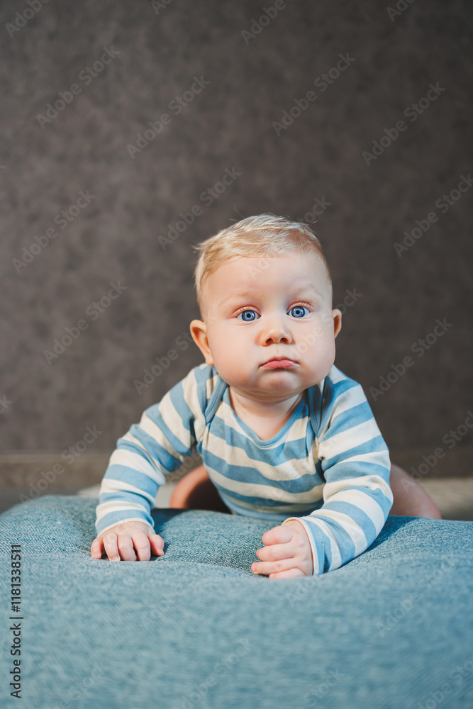 Blond baby crawling on the floor at home. Child development. Boy learning to crawl.