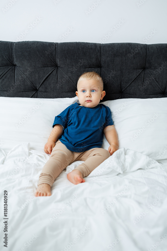 A blond one-year-old boy in a blue T-shirt lies on a bed with white sheets. The baby plays while sitting in bed. A blue-eyed little boy.