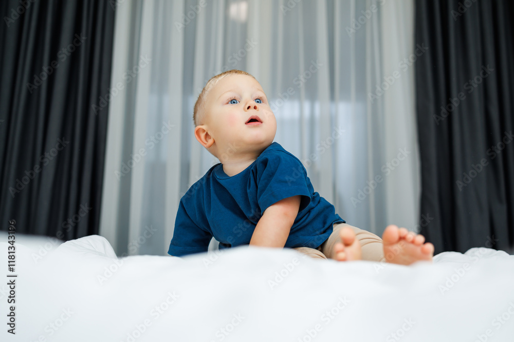 A blond one-year-old boy in a blue T-shirt lies on a bed with white sheets. The baby plays while sitting in bed. A blue-eyed little boy.