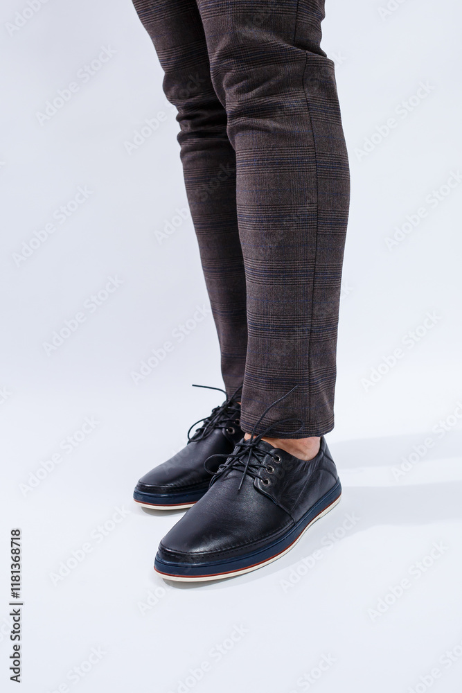 A man is wearing classic black shoes made of natural leather on lace, shoes for men under business style