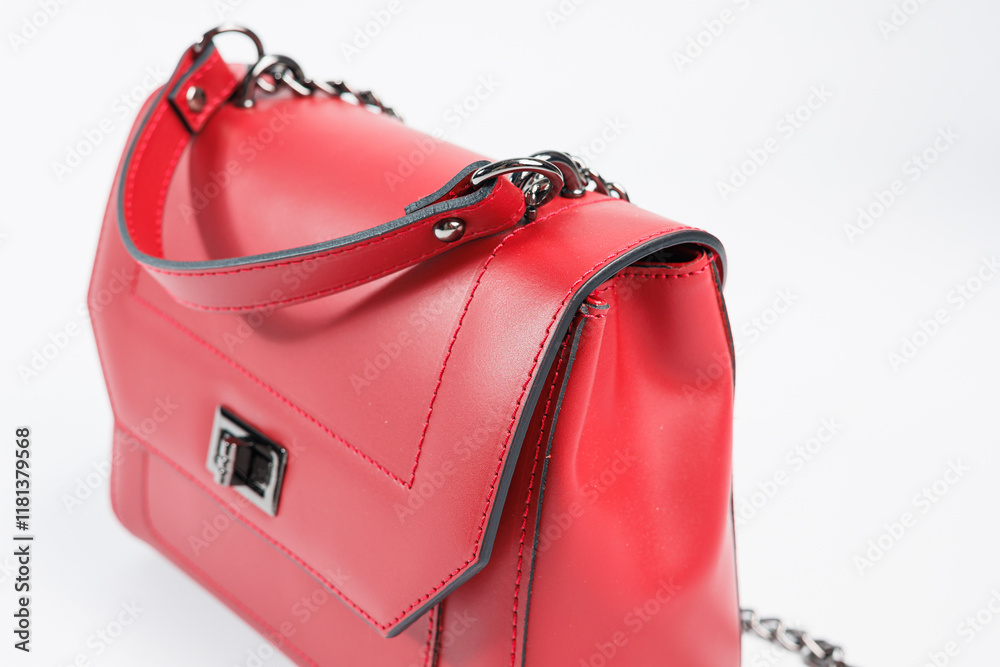 New women's red bag with bronze fittings on a white isolated background. New collection of leather bags