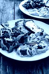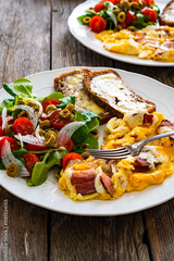 Continental breakfast - scrambled eggs with bacon, slices of bread and fresh salad on wooden table