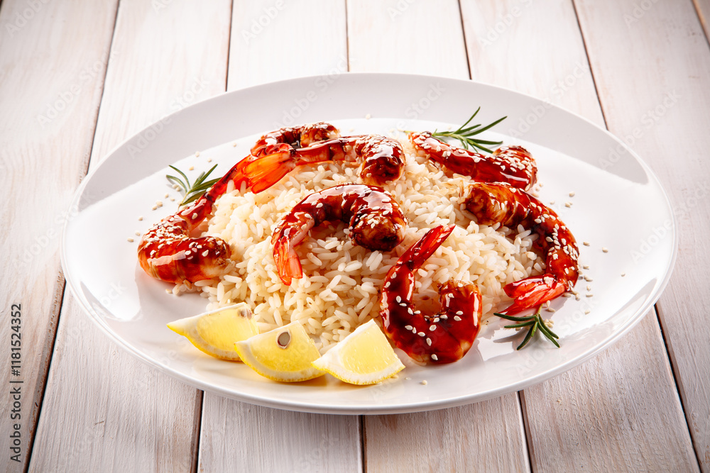 Fried shrimps with boiled white rice and sesame seeds on wooden table