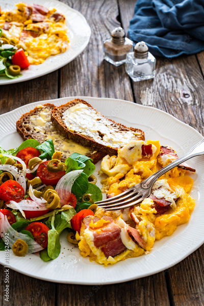 Continental breakfast - scrambled eggs with bacon, slices of bread and fresh salad on wooden table