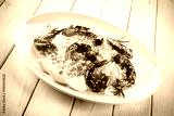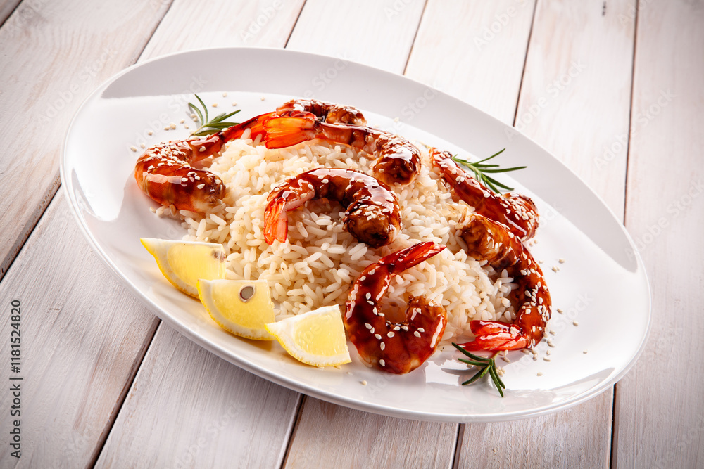 Fried shrimps with boiled white rice and sesame seeds on wooden table
