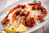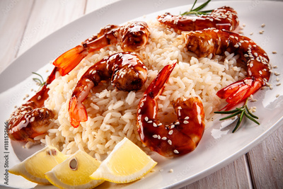 Fried shrimps with boiled white rice and sesame seeds on wooden table