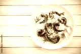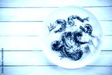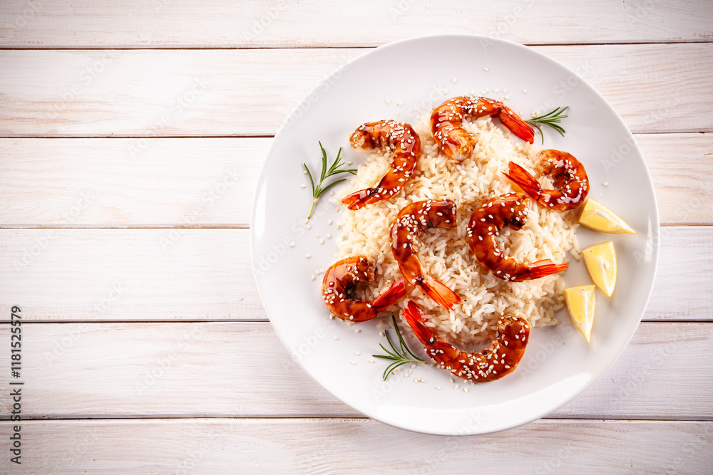 Fried shrimps with boiled white rice and sesame seeds on wooden table