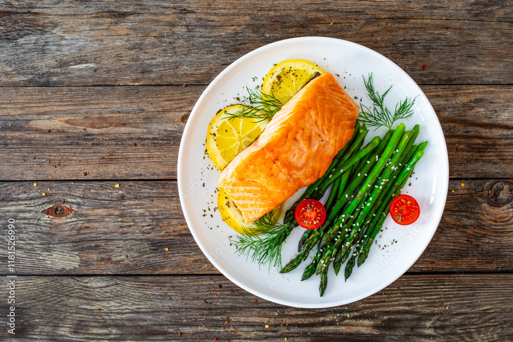 Fried salmon steak with cooked green asparagus, cherry tomatoes and lemon slices served on white plate on wooden table