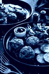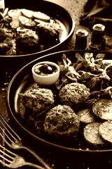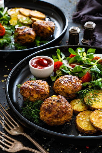 Fried pork meatballs with fried potatoes, ketchup and fresh vegetables on black table