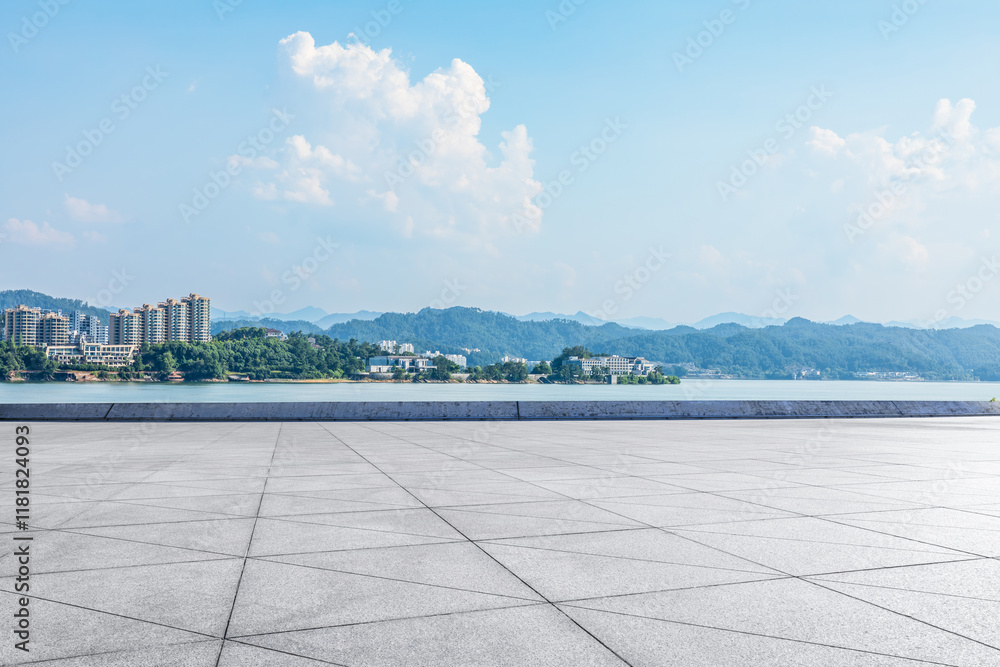 Empty square floor and lake with island nature landscape in summer. Outdoor natural background.