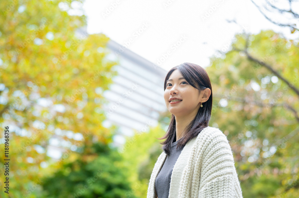 公園でマフラーをして笑顔の日本人女性