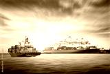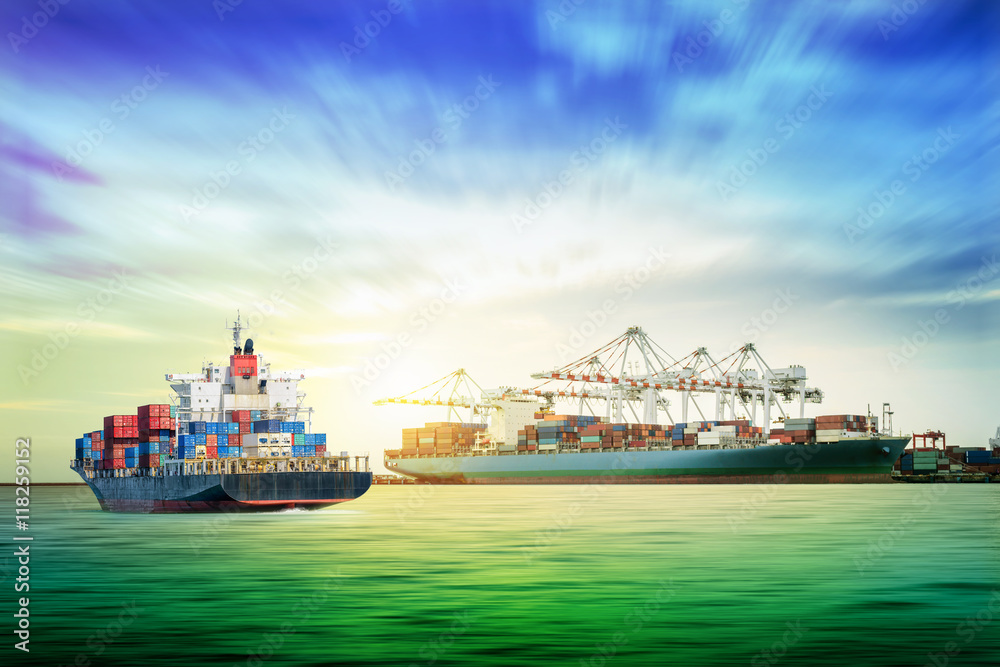Logistics and transportation of International Container Cargo ship with ports crane bridge in harbor for logistic import export background and transport industry.