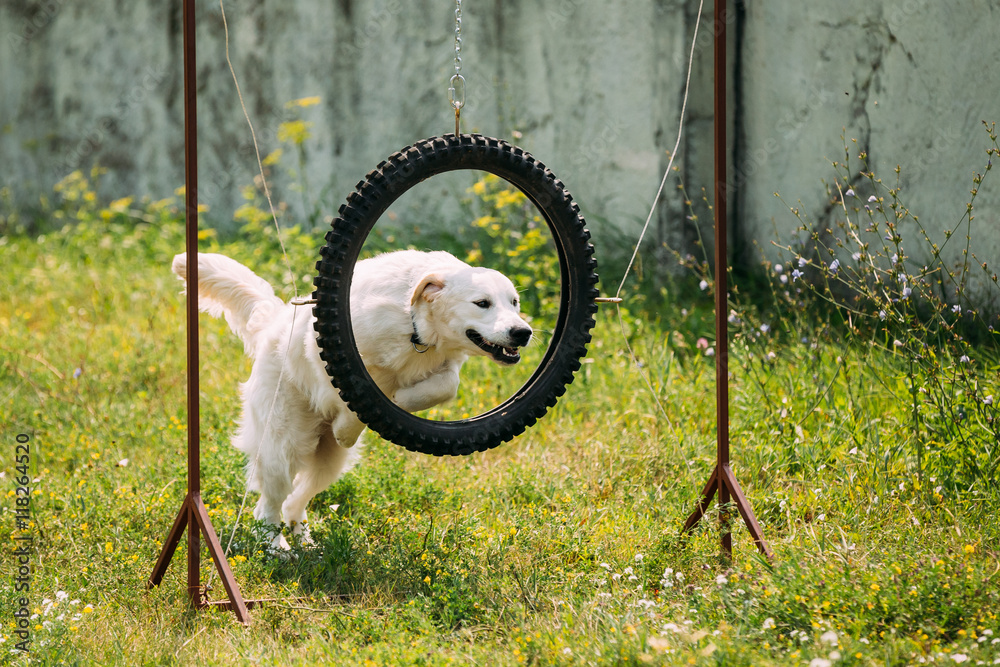 Jumping Through Suspended Tire Tyre Hoop Trained White Yellow Labrador