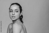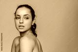 Portrait of beautiful young hispanic latin woman girl with clean fresh skin on beige background looking aside copy space. Face care, facial treatment, cosmetology, beauty and spa concept